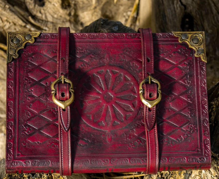 Scopri il 'Grimorio degli incantesimi', un libro artigianale de 'El Marqués de LARP', creato per coloro che cercano un tocco di magia e mistero nella loro vita quotidiana. Realizzato interamente a mano, presenta copertine in cuoio di alta qualità e un'incisione unica che si distingue per il suo design mistico e dettagliato, con motivi geometrici e un emblema centrale a rosone che racchiude tutta la sua essenza soprannaturale. Le cinghie in cuoio con fibbie metalliche non solo lo proteggono, ma gli conferiscono un fascino rustico perfetto.