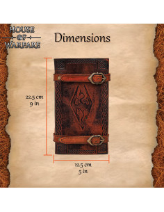 La chiusura con due cinturini di pelle e fibbie in ottone mantiene le pagine sicure, permettendo di aprire e chiudere con facilità, e aggiunge un tocco visivo vintage che si adatta a qualsiasi ambientazione medievale o fantastica. Le borchie che fissano i cinturini rafforzano la sensazione di robustezza, senza perdere l'eleganza complessiva.