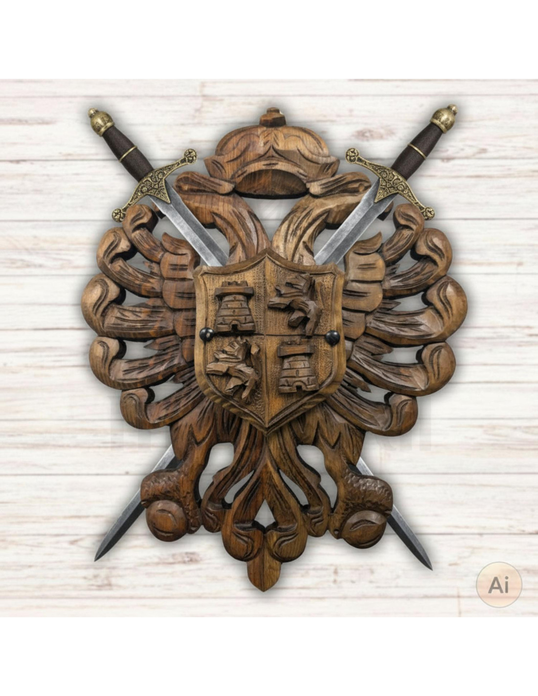 Questa panoplia in legno dal design medievale è il complemento perfetto per esporre spade incrociate di dimensioni infantili. Con dimensioni di 46x36 cm, lo scudo centrale mostra un maestoso aquila bicipite, un simbolo di potere e nobiltà che evoca l'estetica dell'epoca medievale.