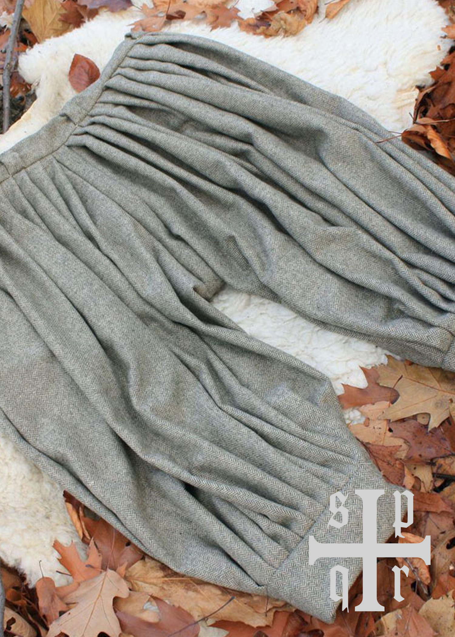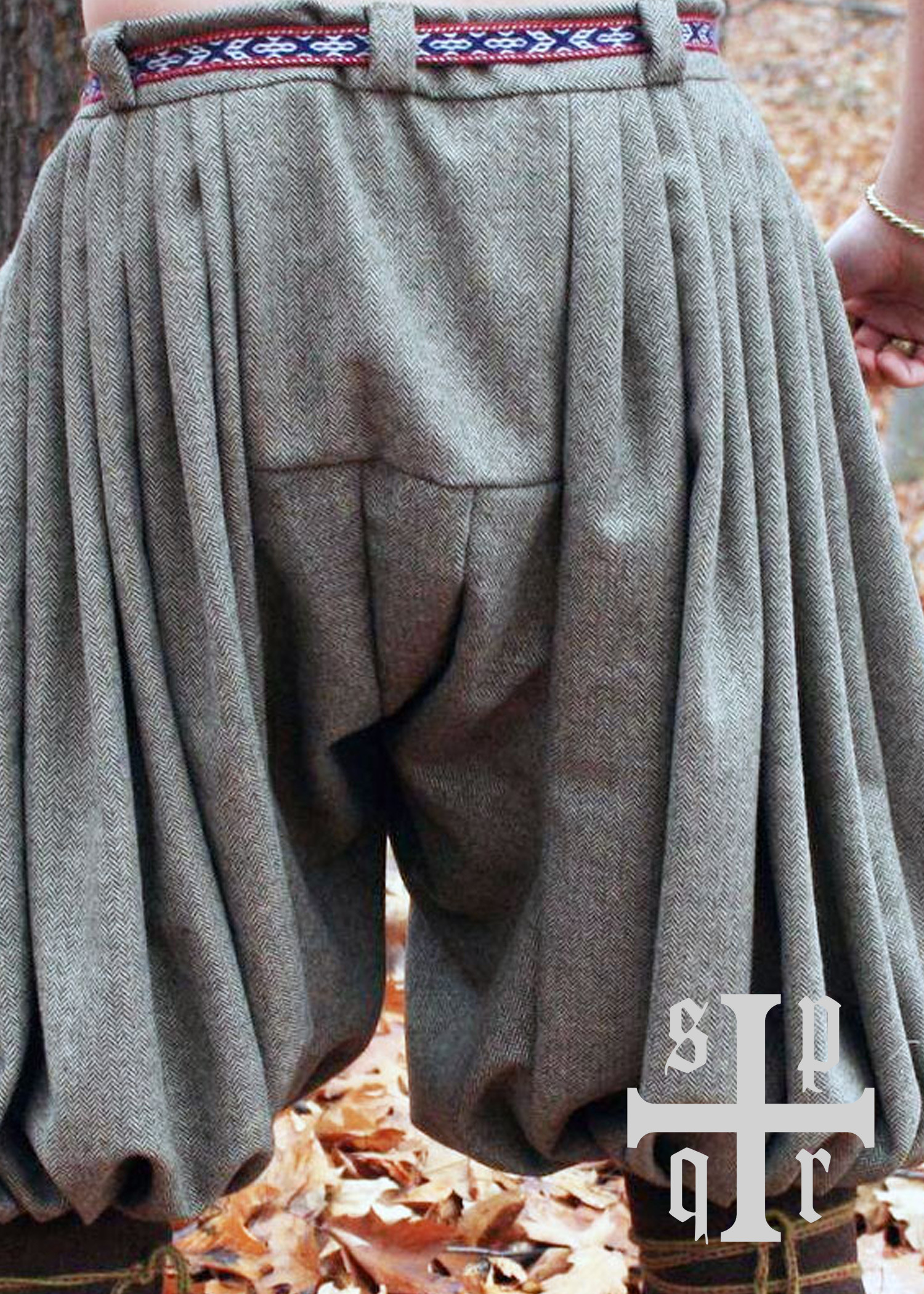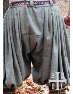 Questi pantaloni larghi vichinghi o leggings larghi sono storicamente accurati in quanto possono essere trovati su alcune delle pietre pittoriche di Gotland. Sono realizzati con una miscela di lana e trama a spina di pesce. Il suo taglio si ispira ai ritrovamenti archeologici di Hedeby (Haithabu) ed è caratterizzato dalle pieghe in vita. Non hanno una mosca in vita.