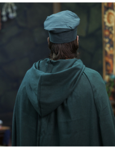 Nell'immagine si apprezza come il cappello combini con un mantello corto e una tunica chiara, creando un insieme armonioso: la texture leggermente ruvida dei vestiti suggerisce autenticità, mentre la chiusura metallica e il cordoncino contribuiscono con piccoli dettagli funzionali che arricchiscono l'insieme. Questa coerenza visiva facilita la creazione di un completo per fiere, rappresentazioni o sedute fotografiche.