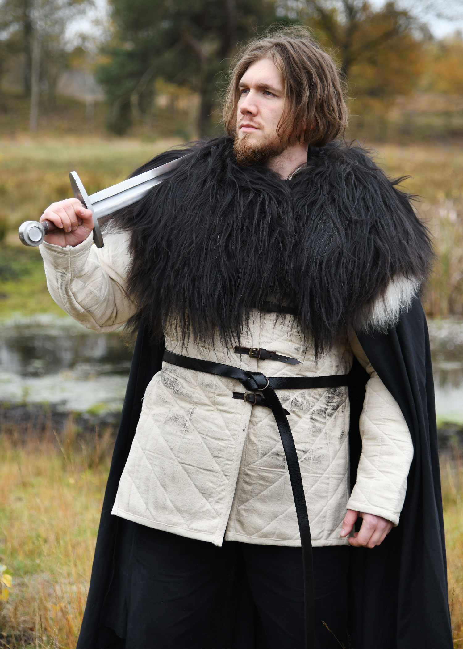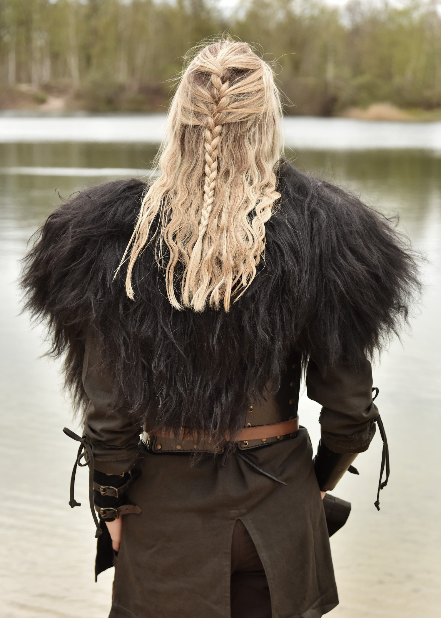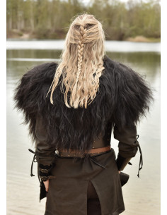 Pelle della spalla in pelle di pecora nordica, nera. Questo cappotto è perfetto per avvicinarsi un po' al guerriero selvaggio o al coraggioso vichingo. Che si tratti di un festival vichingo o di un mercato medievale, con questa pelle per le spalle non ci sarà più freddo. Ogni festival può essere goduto al massimo e ogni sedia diventa più confortevole.