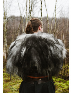 Preparati a distinguerti al tuo prossimo evento con questo mantello a tracolla in pelle di pecora nordica in nero e grigio. Non lasciare che il freddo sia un ostacolo al tuo coraggio vichingo!