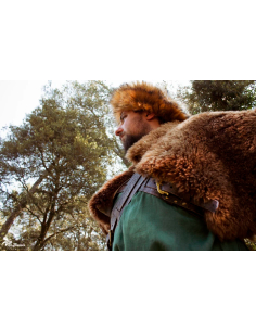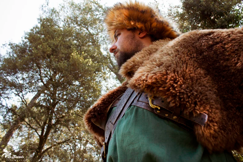 Realizzata a mano in Spagna con pelle di pecora naturale, questa cappa è l'equilibrio perfetto tra funzionalità e tradizione. La sua texture morbida e soffice ti protegge dal freddo più implacabile, permettendoti di affrontare qualsiasi incursione con fiducia. Le cinghie in cuoio invecchiato, incise con motivi decorativi e completate con fibbie e dettagli dorati, non solo garantiscono una vestibilità sicura, ma elevano anche questo accessorio al livello di un'opera d'arte.