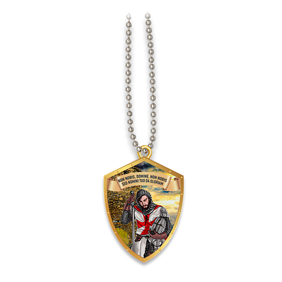 Cerchi un ciondolo dal design unico e significativo? Allora il nostro ciondolo con scudo Cavaliere Templare e la sua leggenda è proprio ciò di cui hai bisogno. Questo imponente ciondolo, a colori e bordato in oro, rappresenta lo scudo del Cavaliere Templare insieme alla sua potente leggenda "Non nobis, domine, non nobis sed nomini tuo da gloriam" - che si traduce come "Non noi, Signore, non noi, ma al tuo nome sia gloria».