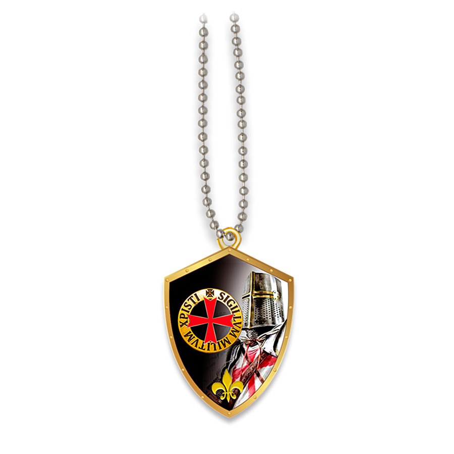 Aggiungi un tocco di stile e distinzione al tuo outfit con il ciondolo dello scudo del Cavaliere Templare con il suo elmo. Questo ciondolo ha un design unico, in cui è rappresentato lo scudo del Cavaliere Templare insieme al suo elmo e alla croce con la leggenda "Xpisti sigilum militum".