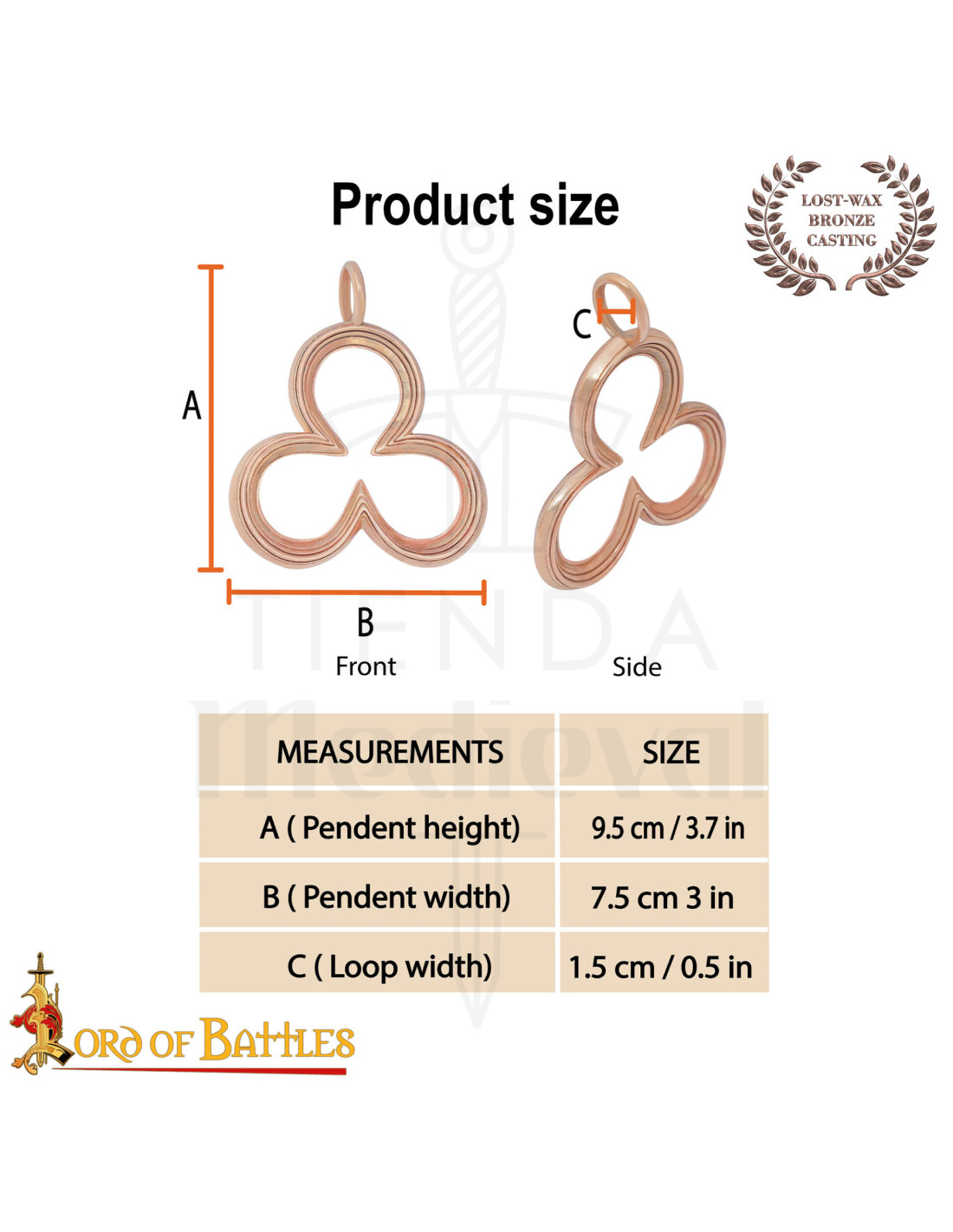 Realizzato con la tecnica tradizionale di fusione a cera persa, il ciondolo presenta una superficie solida e una finitura naturale che conferisce un carattere storico senza rinunciare alla resistenza necessaria per un uso quotidiano o eventi dal vivo. Le linee in rilievo seguono la sagoma del trifoglio, creando un effetto di profondità che cattura la luce e valorizza la sua tonalità di rame dorato, ideale da abbinare a tuniche, capi d'epoca o stili contemporanei.