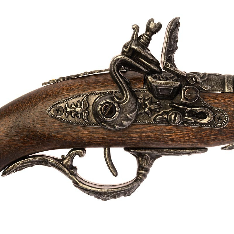 Con una lunghezza di 31 cm e un peso di 460 grammi, questa pistola Terzetta non impressiona solo per la sua autenticità e dettaglio, ma anche per la sua maneggevolezza comoda ed equilibrata, che la rende un pezzo straordinario per collezionisti e appassionati di storia militare. Realizzata interamente in legno di alta qualità, con canna e fornimenti in metallo fuso brunito, questa replica è un'opera d'arte in sé. Le incisioni con motivi floreali aggiungono un tocco di eleganza e raffinatezza, evidenziando la maestria e l'arte degli armaioli del XVIII secolo.