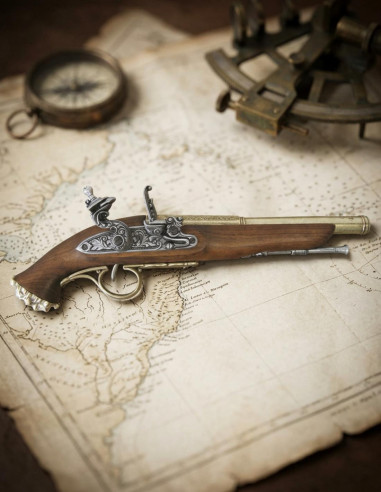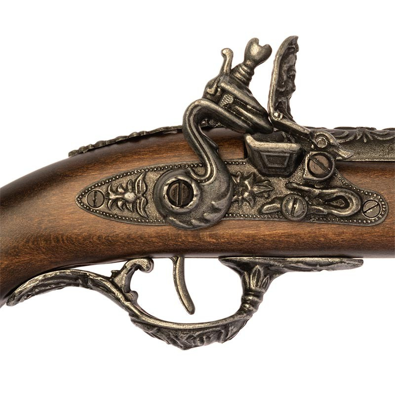 Ogni dettaglio di questa pistola è stato ricreato con cura per catturare l'essenza delle armi del XVIII secolo. La canna, meticolosamente scolpita a due ordini con la bocca pronunciata, è ornata da motivi floreali incisi, a dimostrazione del livello di lavorazione artigianale e di attenzione ai dettagli che è stata posta in essa. La fusione di legno e metallo brunito nella sua costruzione non solo garantisce una replica autentica, ma offre anche un pezzo durevole e di grande bellezza estetica.
