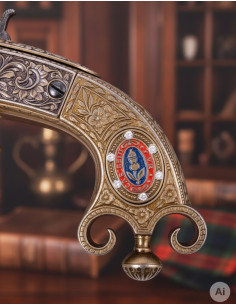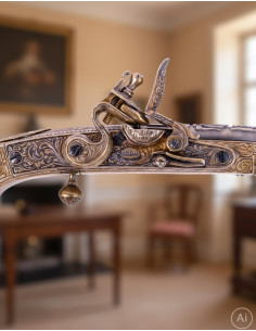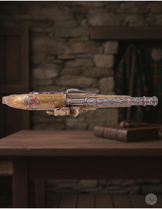 Il suo design ornamentale, ispirato alle armi della sua epoca, si distingue per l'eleganza delle sue incisioni e i dettagli intricati che decorano sia la canna che il calcio. Quest'ultimo, curvato con cura per offrire una presa comoda, include rilievi unici e un emblema che ne rafforza l'autenticità. Le finiture in tonalità dorate e nere conferiscono un contrasto visivo che esalta la sua sofisticatezza.