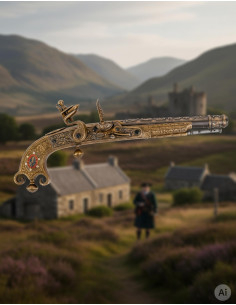 Scopri un pezzo storico che ti trasporterà nella Scozia del 1760. Questa pistola a scoppio, realizzata da Denix, si presenta come una autentica opera d'arte che combina estetica, tradizione e un design da collezione che non passa inosservato. Con una finitura invecchiata che denota il suo carattere artigianale, è ideale sia per gli appassionati di storia che per coloro che cercano di aggiungere un tocco raffinato alla propria collezione personale.