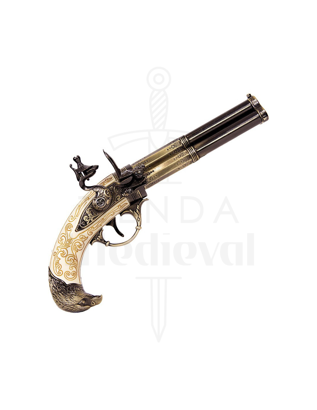 Cerchi un pezzo unico da aggiungere alla tua collezione di armi storiche? Allora non puoi lasciarti scappare questa incredibile replica della pistola a pietra focaia Eagle Head 3 Barrel, direttamente dalla Francia del XVIII secolo.