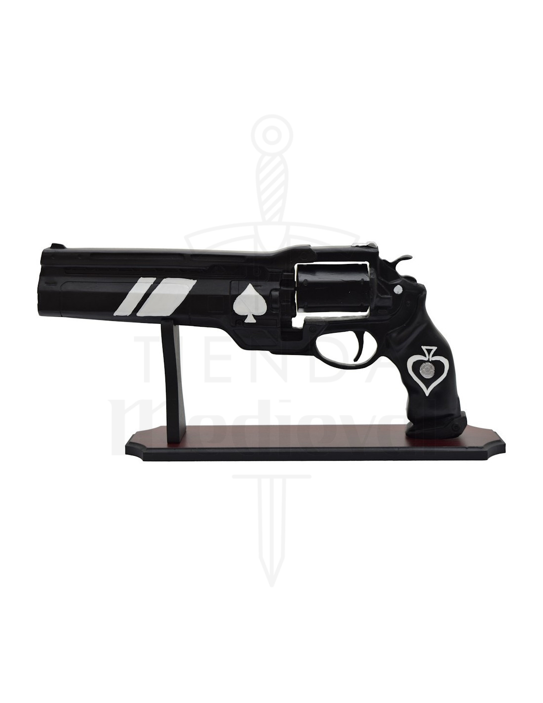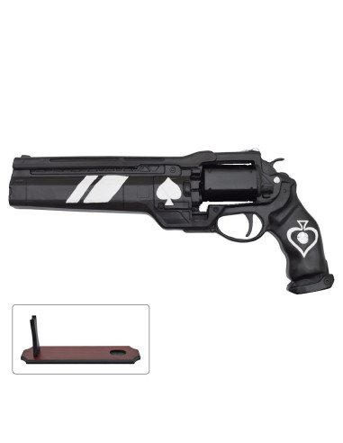 Questa pezzo ornamentale ricrea lo spirito del famoso revolver fantasy, con una finitura nera intensa e dettagli dipinti in bianco che evidenziano il simbolo della carta di picche e il piccolo emblema nel manico, come una fiamma coronata, che gli dà carattere e personalità. Il cilindro, il grilletto e il cane sono scolpiti per mantenere l'estetica classica del design, mentre l'aspetto generale mantiene la sicurezza e la tranquillità di una replica non funzionale, ideale per esposizione su mensole, pareti o angoli tematici.