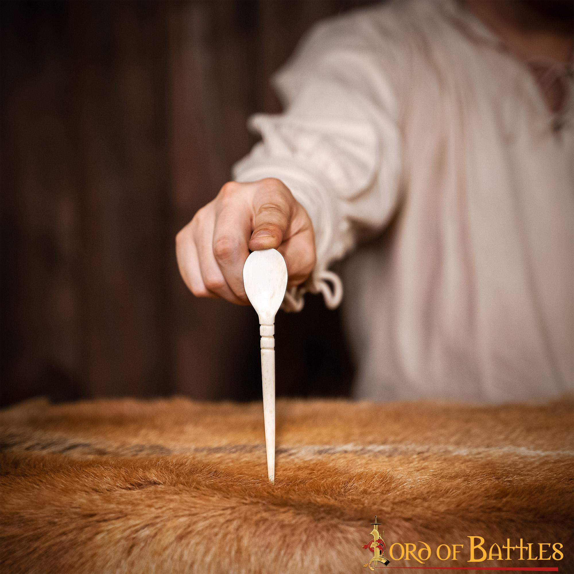 Posate medievali con coperchio marrone: cucchiaio, forchetta e coltello