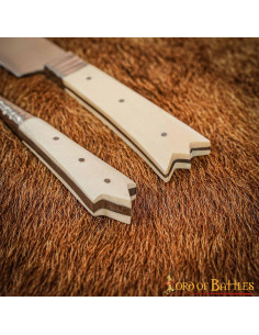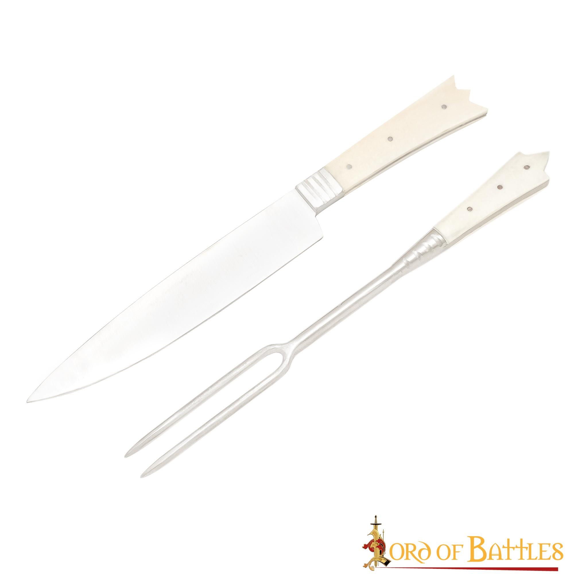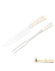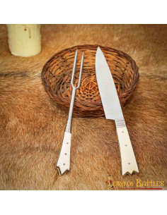Scopri l'eccezionale coltello e forchetta (2 rebbi) della nobiltà del castello medievale, progettato per soddisfare i gusti più esigenti. Queste posate, realizzate con i migliori materiali, uniscono la resistenza dell'acciaio inox all'eleganza del manico in osso.