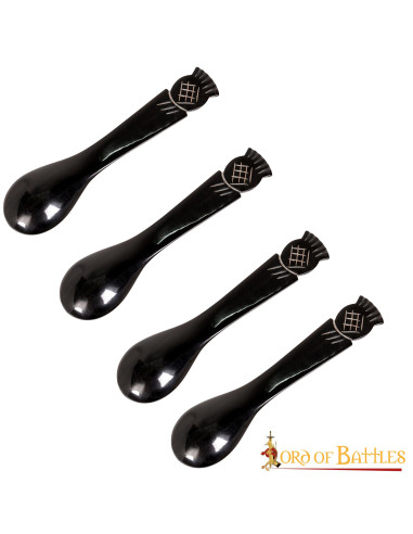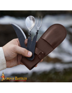 Posate medievali con coperchio marrone: cucchiaio, forchetta e coltello