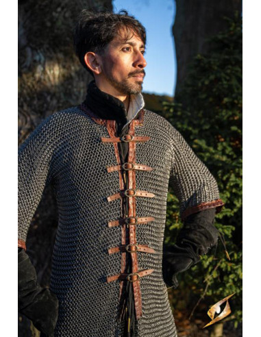 Il nostro haubergeon in acciaio inossidabile è realizzato a mano con anelli da salto calibro 18, di circa 9 mm di diametro ciascuno, rivettati con rivetti a cupola per una maggiore resistenza. Inoltre, si alternano a solidi anelli piatti per garantire in ogni momento una protezione ottimale.
