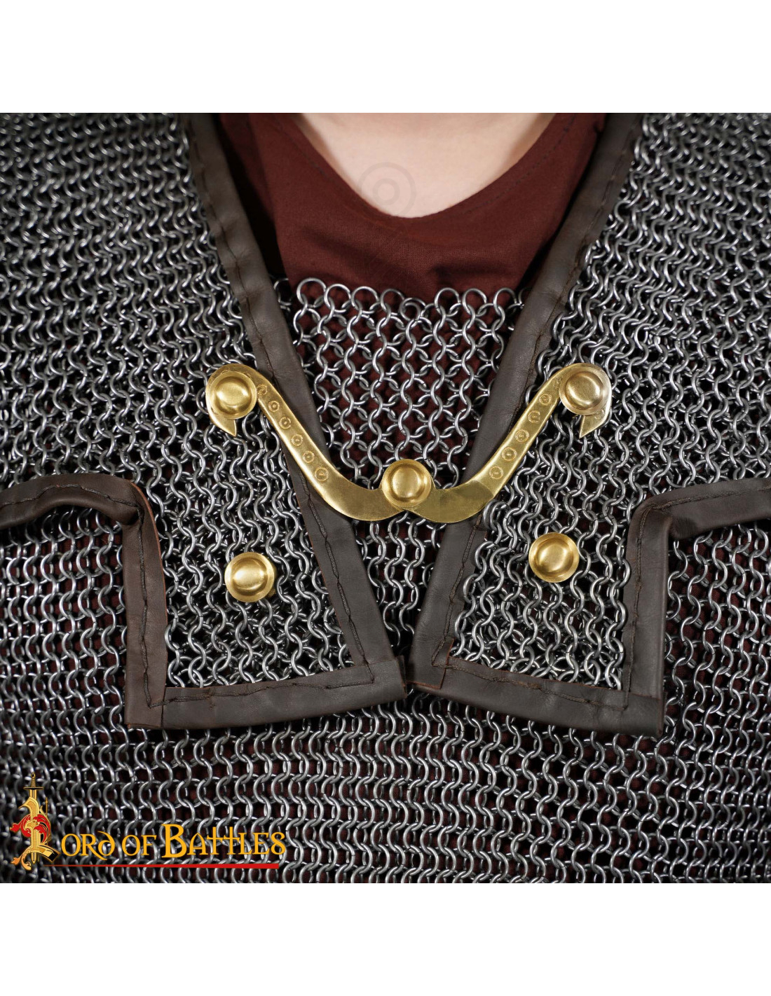La chiusura decorativa in ottone riproduce l'estetica degli yoke romani, conferendo un'aria di autorità e, allo stesso tempo, una funzione pratica: aiuta a mantenere la cota in posizione sulle spalle, migliorando la stabilità e l'ergonomia durante combattimenti e movimenti intensi. Il bordo rinforzato in pelle con rivetti dorati protegge le zone di maggiore usura, prolungando la vita utile del completo.