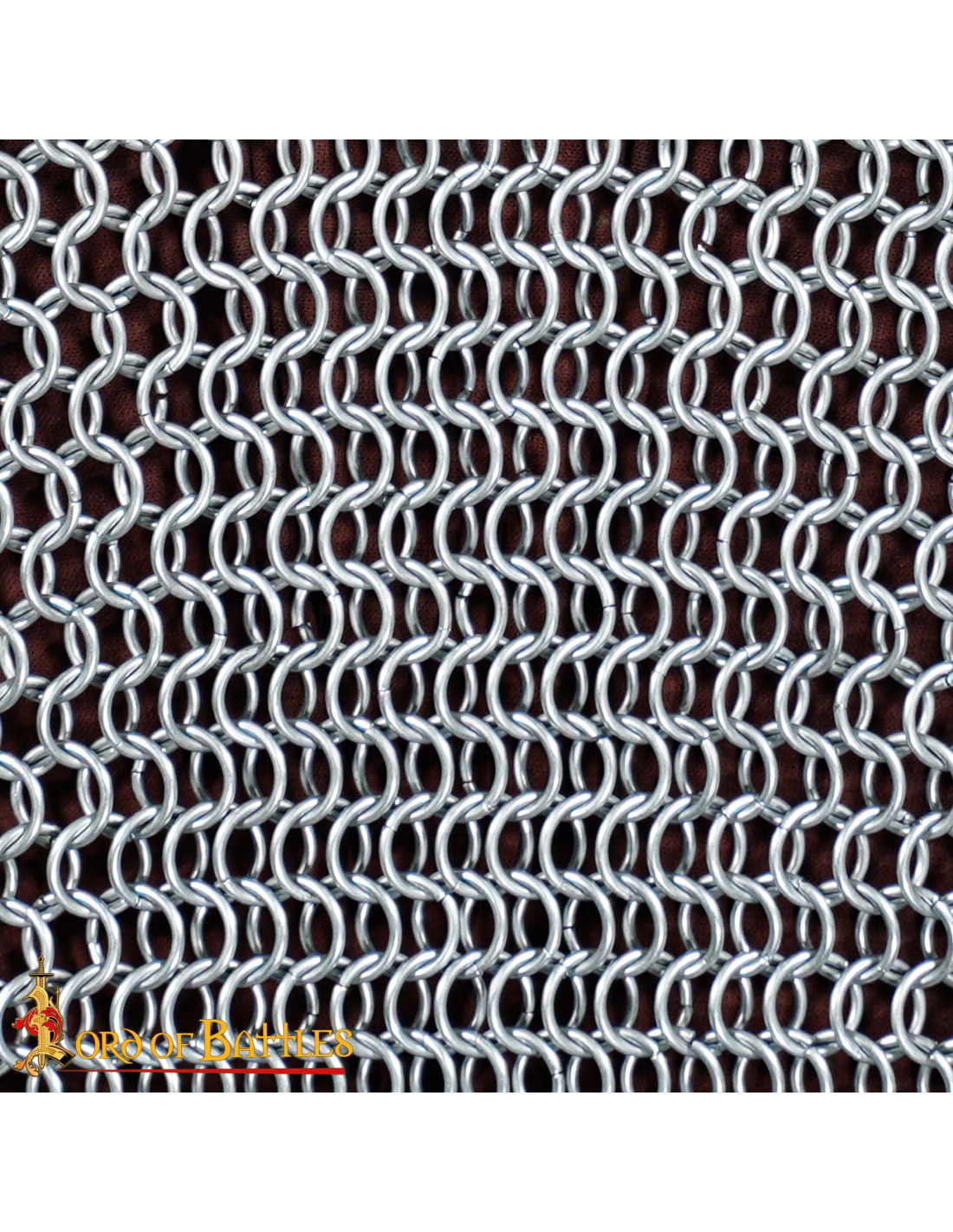 Gli anelli intrecciati creano un tessuto flessibile e resistente che distribuisce il peso, evitando punti di pressione e facilitando lunghe giornate in battaglie simulate, prove sceniche o sfilate. La finitura in acciaio con trattamento oleato riduce i riflessi, esaltando l'aspetto di un pezzo usato in campagna, e facilita la sua manutenzione per esposizione o uso continuato.