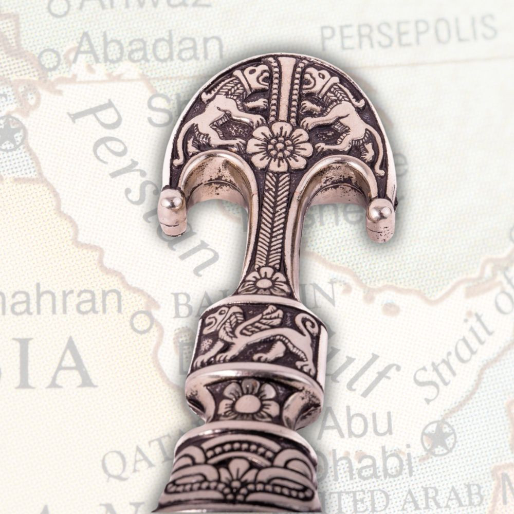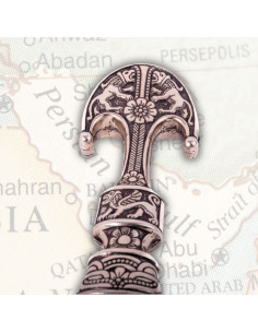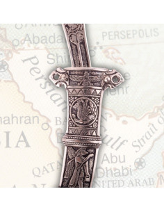 La lama della daga, finemente lucidada e curva, evoca la tradizione delle armi persiane, note per la loro eleganza ed efficacia. Il suo design non solo cattura gli sguardi, ma riflette anche l'attenzione ai dettagli caratteristici dell'epoca. Da parte sua, il fodero ornamentato è una vera opera d'arte; i rilievi accuratamente elaborati potrebbero rimandare a motivi culturali e storici dell'antica Persia. Inoltre, la sua forma curva facilita l'uso e la comoda conservazione.