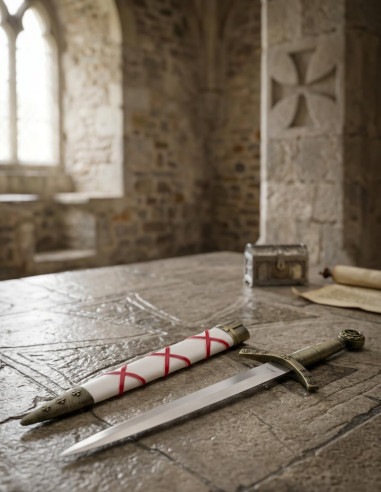 Per la sua esposizione, è incluso un supporto in legno a forma di scudo, decorato con motivi che completano perfettamente il design della spada. È ideale per mostrare la tua spada nel soggiorno, in ufficio o in uno spazio personale.