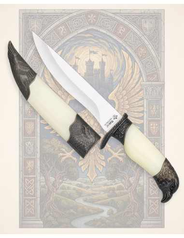 Il pomolo a forma di testa d'aquila e i rinforzi metallici nella custodia con rilievi dell'uccello completano il tutto con un sigillo distintivo che proietta nobiltà e tradizione. Se sei interessato ad acquistare il Pugnale medievale modello Aquila finitura argento antico come pezzo da collezione o per completare un'ambientazione tematica, il suo design narrativo e la finitura invecchiata lo rendono una scelta naturale.