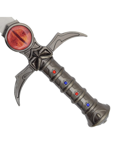La guardia, con le sue due estensioni curve verso l'alto e l'ornamento centrale rosso a forma di occhio, aggiunge un punto focale che attira lo sguardo e stimola conversazioni. Tutto ciò è esposto su una base di legno nero con supporto circolare, che mantiene la daga in posizione verticale, sicura e stabile, senza complicazioni nel posizionarla su uno scaffale, in una vetrina o su una scrivania.