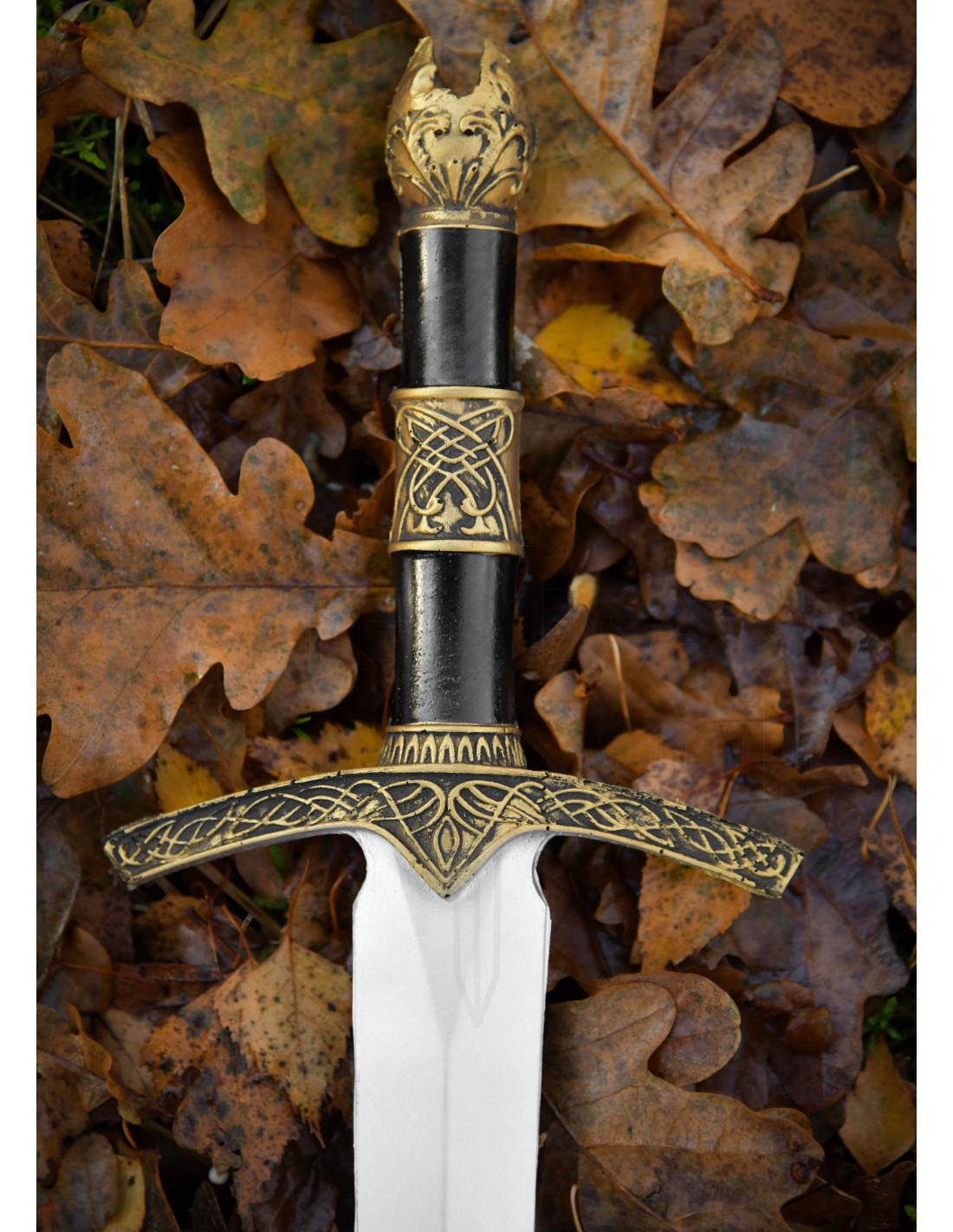 La guardia in tono oro invecchiato, riccamente ornata, e il manico nero con anelli dorati incisi, offrono un punto focale visivo che completa qualsiasi costume, dalla tunica di un mago al mantello di un cavaliere. Il pomolo, a forma di corona o di un fiore stilizzato, aggiunge un tocco elegante, ideale per coloro che si prendono cura di ogni dettaglio del loro outfit.