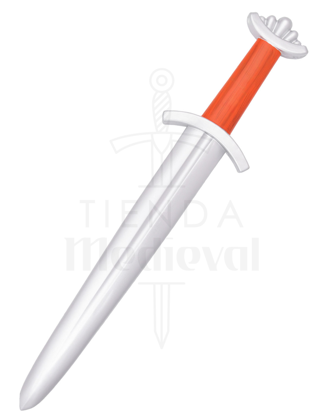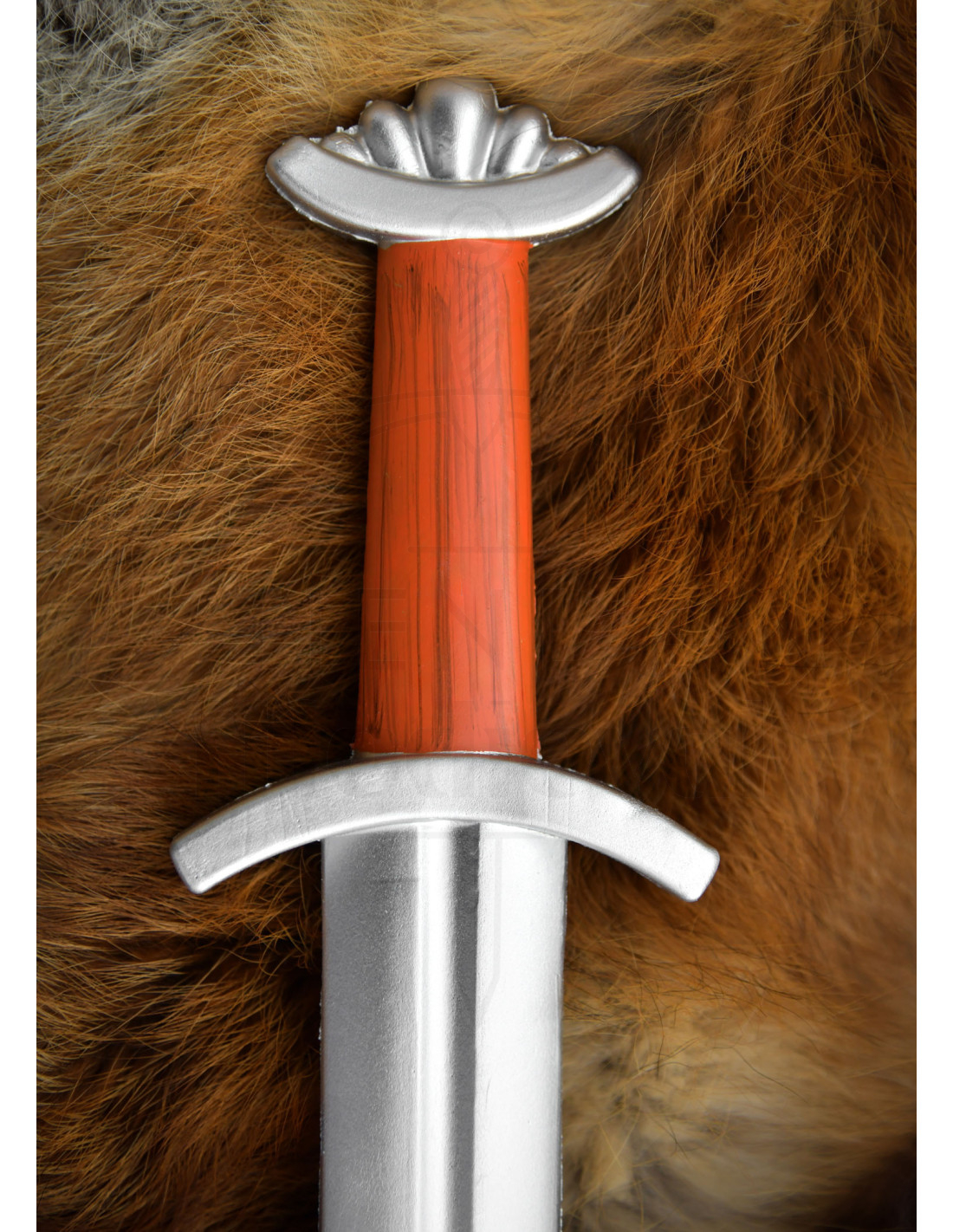 La sua finitura bianca-argentea ricrea il luccichio dell'acciaio antico, mentre l'impugnatura arancione con venature simulate aggiunge calore visivo e un grip che sembra legno reale, senza rinunciare alla durata. Il guardamano e la punta dell'impugnatura in toni chiari rinforzano l'aspetto storico, completato da un pomolo a cinque bulbi ispirato a pezzi vichinghi, che aggiunge personalità senza complicazioni.