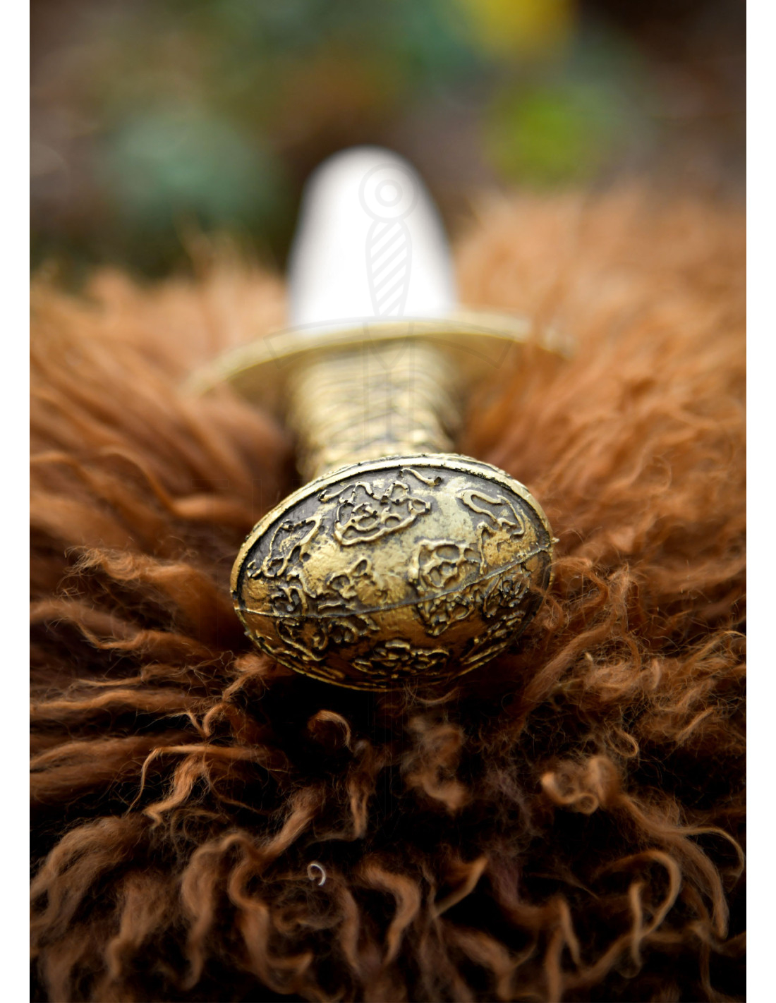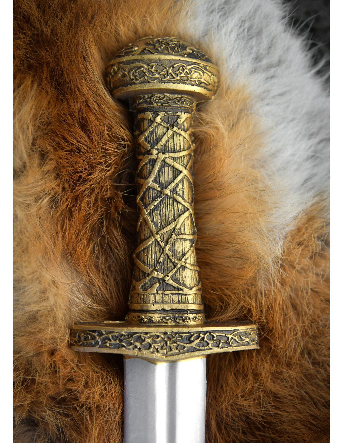 Il manico dorato, con rilievi che evocano motivi nordici e celtici, trasforma un semplice impugnatura in un punto di orgoglio. Questa trama intagliata non solo appare autentica, ma facilita anche una presa ferma e confortevole, ideale per movimenti rapidi e controllati. La guardia dorata e il pomo arrotondato, decorato con motivi incisi, completano un design che trasmette autorità e tradizione.