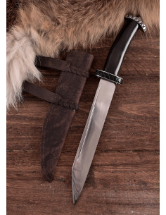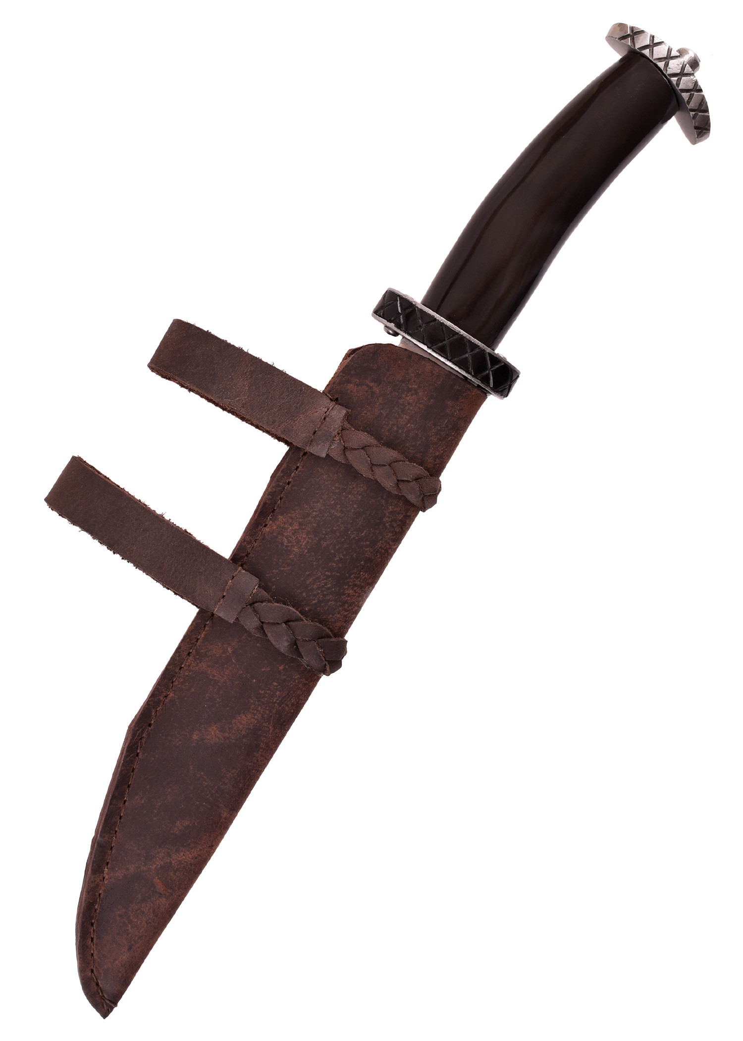 Questo coltello presenta un'elsa in corno decorata e una protezione in acciaio a due dischi per fissare la piastra in corno ornata da due rivetti. La lama in acciaio al carbonio non è affilata, il che la rende sicura per l'uso nelle situazioni quotidiane. Inoltre, la spedizione include un fodero in pelle che si adatta perfettamente al coltello, rendendolo facilmente trasportabile e accessibile in ogni momento. Con una lunghezza totale di circa 36 cm e una lama di 22,5 cm, questo coltello Seax corto è un autentico pezzo che non può mancare nella collezione di ogni amante della storia medievale.