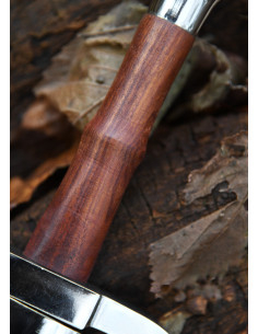 La sua lama in acciaio brillante, con una finitura lucida, non è solo visivamente impressionante, ma garantisce anche un'eccezionale performance. Ogni taglio e ogni movimento si sentono naturali, grazie al suo manico in legno sagomato che offre una presa sicura e comoda. La guardia metallica, con il suo design curvato, non aggiunge solo un tocco di sofisticatezza, ma protegge anche le tue mani, permettendoti di maneggiarla con fiducia.