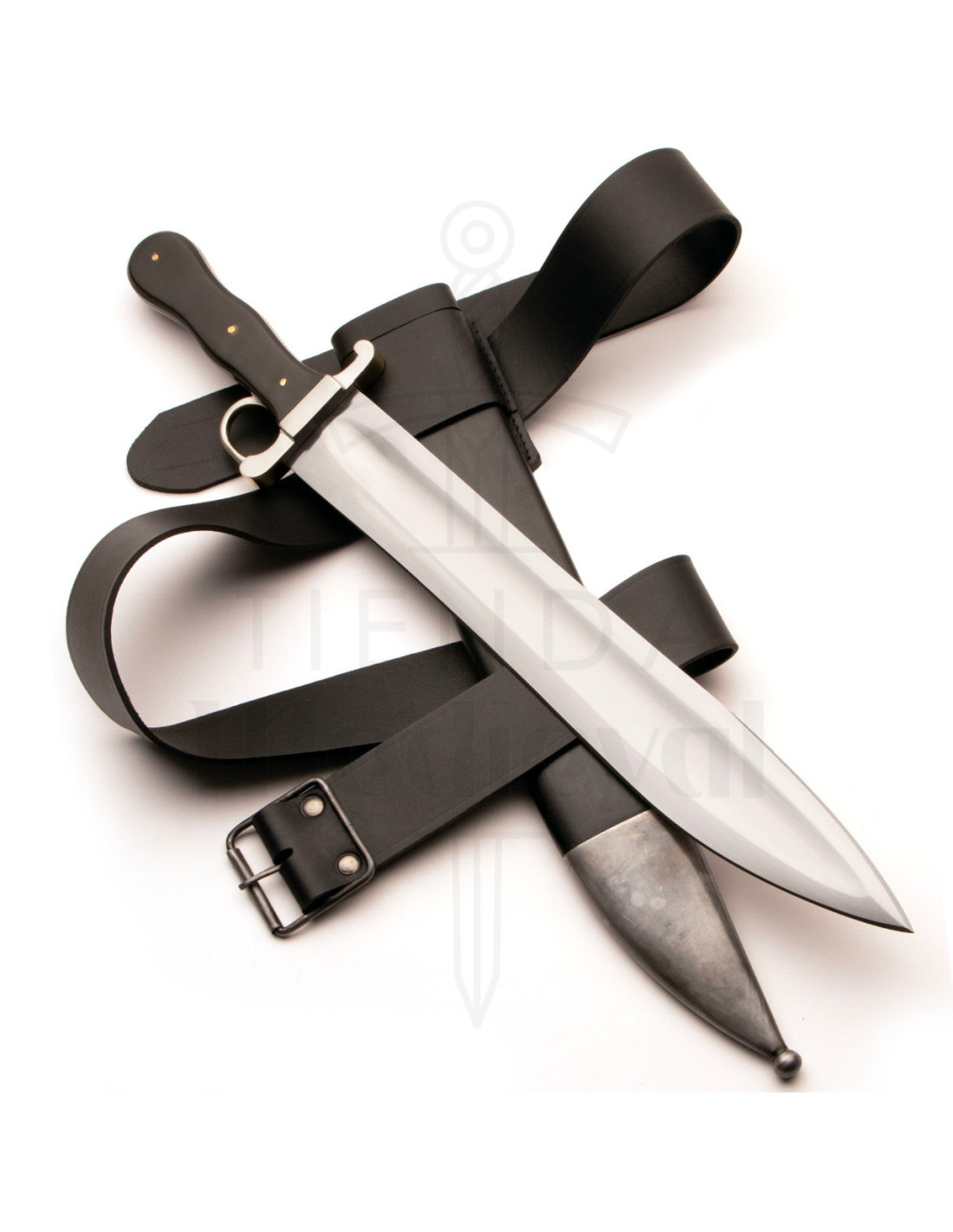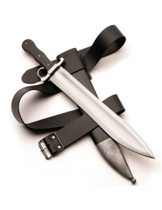 Include fodero e cintura, facilitando il trasporto o l'esposizione come un insieme storico, e la cintura è disponibile in una taglia ampia che copre circonferenze da 81 a 124 cm, per una maggiore versatilità nel posizionarlo in diverse vesti o esposizioni.