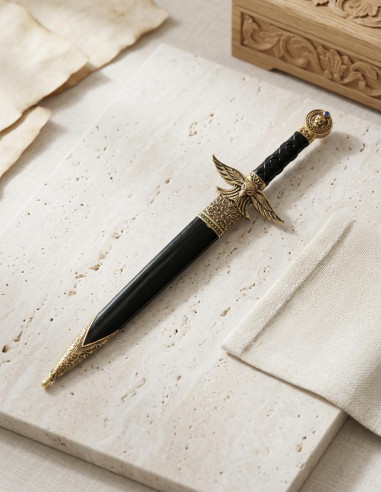 Trasforma il tuo ambiente e la tua mente con la sicurezza di possedere un oggetto che esala esclusività e potere. La lama in acciaio inossidabile temperato ti offre precisione e resistenza, accompagnandoti in ogni sfida. La certificazione di qualità e origine di Toledo garantisce che stai acquisendo un pezzo autentico, forgiato con la tradizione e la maestria che solo una città come quella può offrire. La Daga Boabdil diventa più di un'arma: è un simbolo di coraggio, un promemoria invisibile del fatto che anche tu puoi difendere ciò che valorizzi di più, con la stessa grazia e forza che hanno definito il suo leggendario possessore.