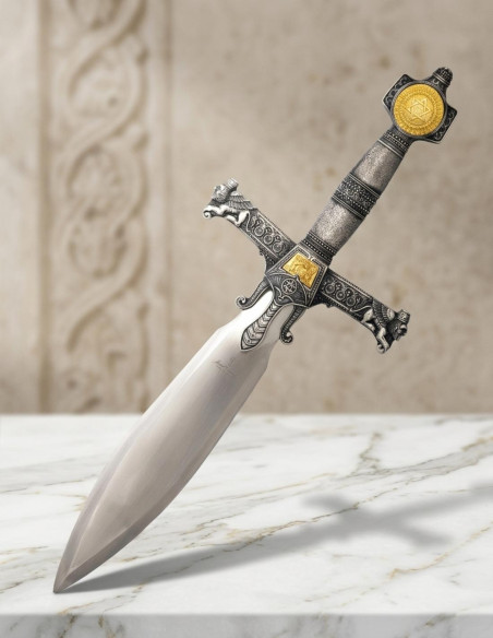 Immagina di possedere un pezzo che non solo arricchisce e prestigia, ma attiva anche il tuo senso di appartenenza a una narrazione antica e nobile. Il pugnale Salomone, con il suo finitura in argento invecchiato, ti invita a attraversare epoche di gloria e mistero, facendoti sentire come un custode della storia. L'artigianato di Toledo, riflesso in ogni dettaglio, garantisce che il tuo acquisto non sia solo un oggetto, ma un lascito tangibile, un simbolo di distinzione che parla del tuo buon gusto e rispetto per la cultura.
