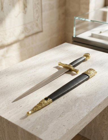 Hai mai sognato di sentirti come un vero guerriero o cavaliere? Quella sensazione di controllo assoluto, di portare con te un oggetto che rappresenta la forza e la storia di epoche passate. La daga medievale con fodero è molto più di un elemento decorativo; è il tuo passaporto per un mondo in cui il coraggio e l'autenticità dominano ogni momento. Con un design che respira storia, questa daga ti permette di ricreare battaglie epiche o di sfoggiarla con orgoglio in eventi a tema, giocando con la leggenda che porti dentro. Grazie alla sua lama in acciaio al carbonio, resistente e durevole, ogni movimento sarà preciso. Ha la misura perfetta (20 cm di lama), per poterla maneggiare con sicurezza, senza compromettere l'eleganza. I suoi decori in metallo, che imitano l'autentica estetica medievale, e l'impugnatura che richiama l'avorio, rendono questo pezzo simbolo di forza e distinzione, una vera dichiarazione di potere e legato.