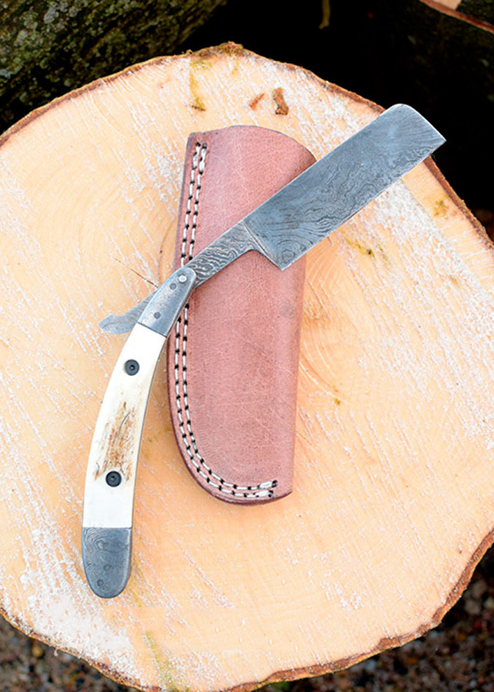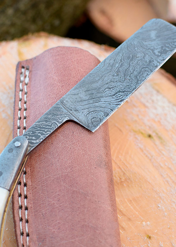 Rasoio in acciaio damasco con fodero in cuoio (23 cm.)