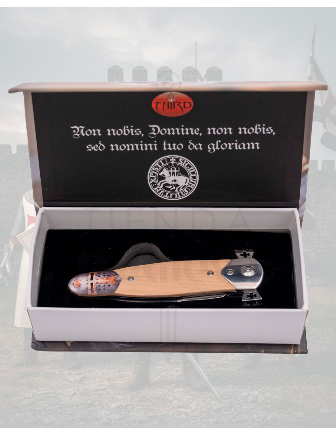 Il pomolo in acciaio con croci, lucido fino a ottenere una finitura a specchio, porta un tocco di distinzione che trasforma ogni uso in una piccola cerimonia. Il manico in legno di faggio offre una superficie calda e liscia che si adatta comodamente alle dita, mentre l'impronta 3D ricrea il casco templare, apportando un rilievo tattile che accentua la presa senza rinunciare all'eleganza.