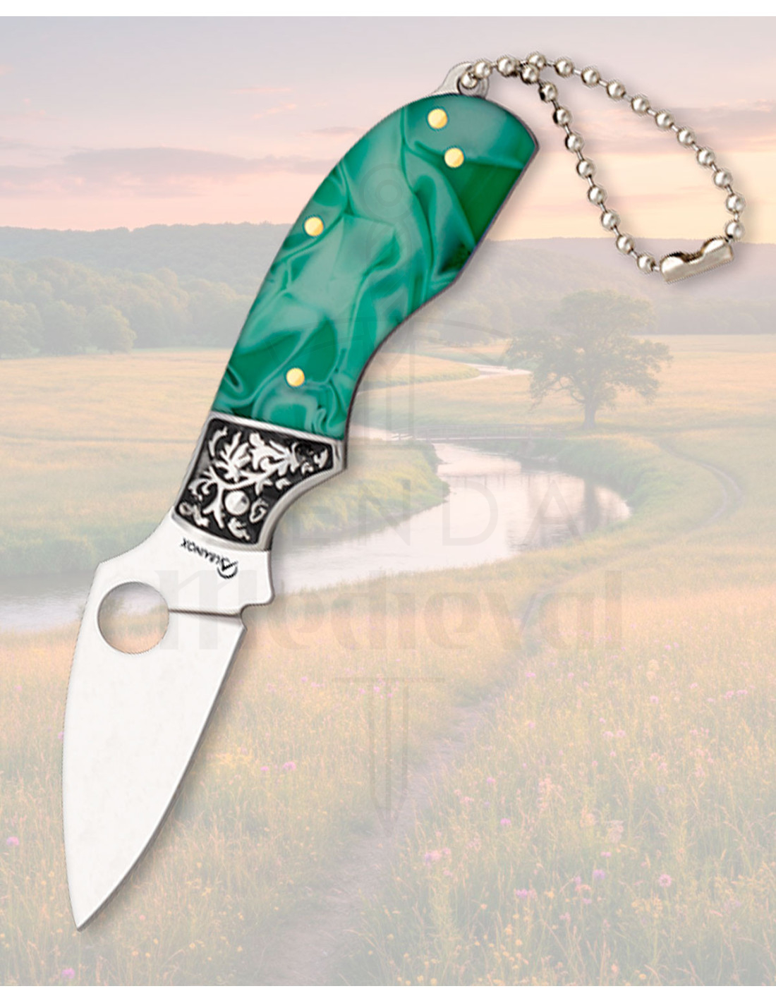 Il manico in acrilico verde presenta un motivo marmorizzato che lo rende un pezzo distintivo e offre una presa piacevole e salda. I rivetti metallici dorati e il pezzo centrale decorativo in rilievo aggiungono carattere senza sacrificare resistenza, mentre le guarnizioni in acciaio rinforzano la sua struttura.