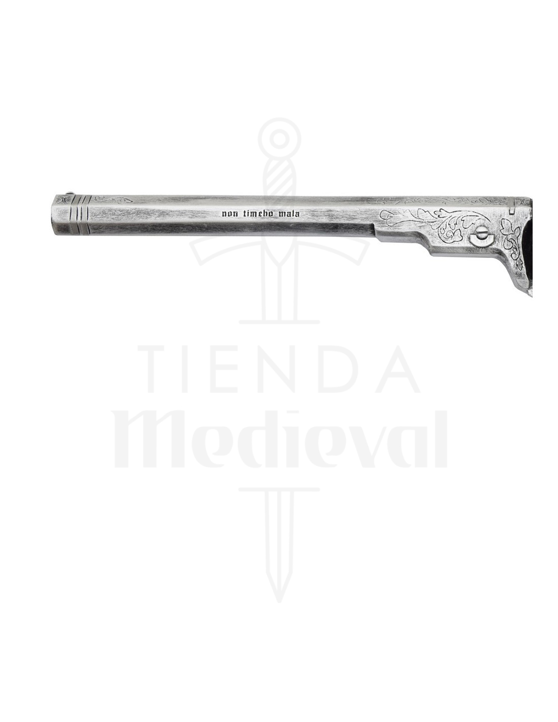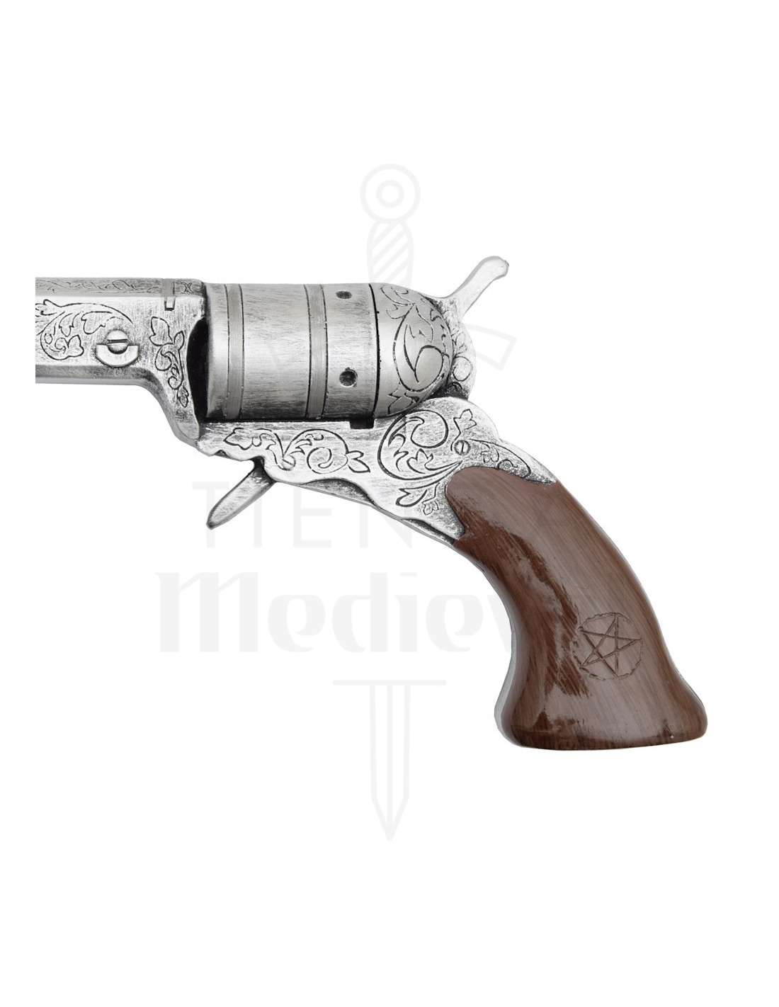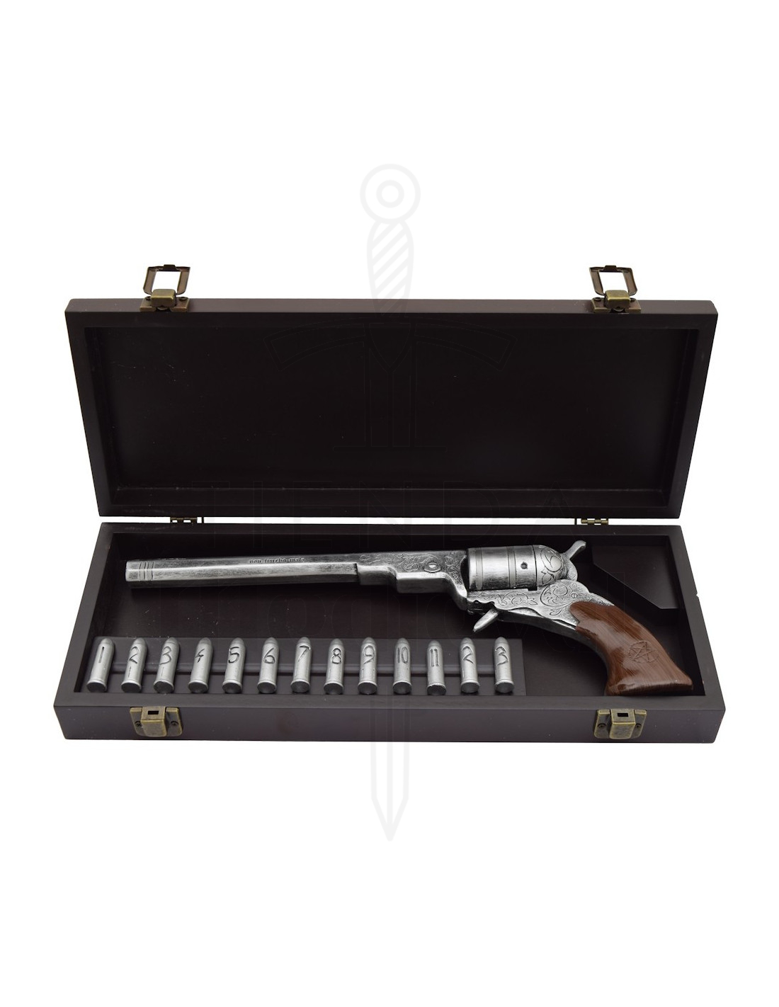 Questa replica evoca il mitico revolver legato a Dean, con finiture che sembrano raccontare storie: il corpo mostra delicate incisioni, e il manico con aspetto di legno offre calore e autenticità visiva. La presentazione in una scatola di legno scuro con cerniere metalliche la rende un oggetto che attira sguardi, ideale sia per i collezionisti che per chi cerca un dettaglio distintivo per il proprio spazio.