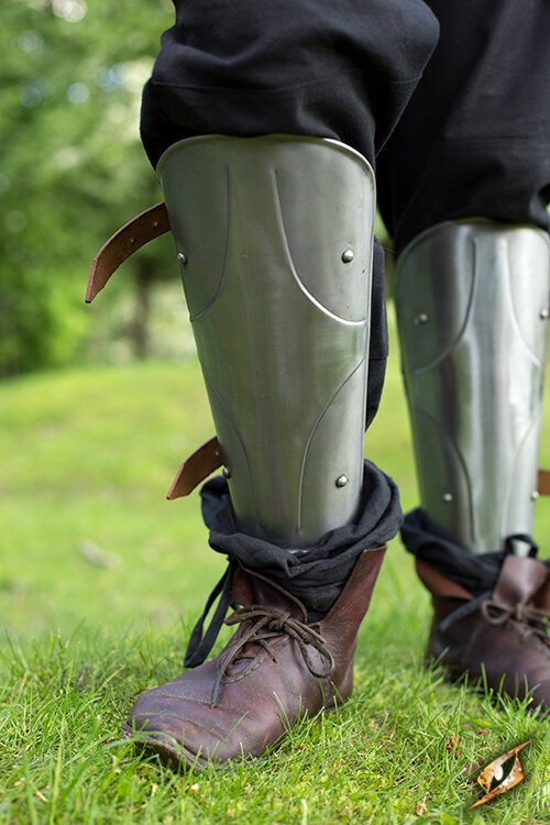 Questi schinieri sono il complemento perfetto per proteggere le tue gambe durante le tue avventure medievali. Con un design arrotondato sui bordi e decorato con rivetti in acciaio lucido, questi mezzi schinieri non solo ti daranno una protezione ottimale, ma staranno anche benissimo sulle tue gambe.
