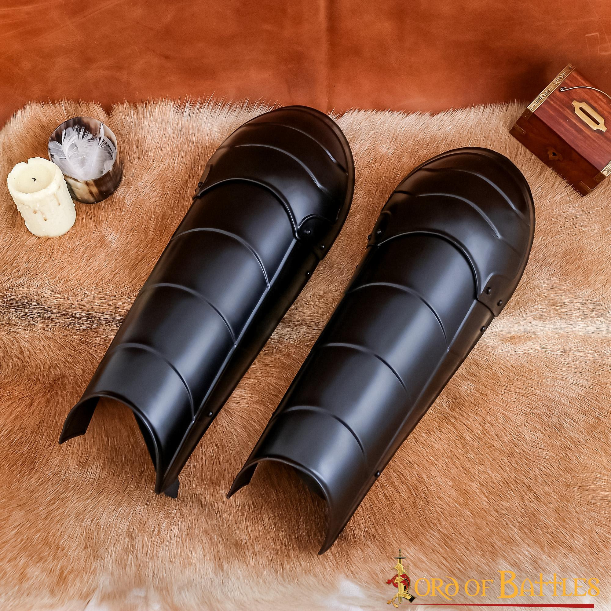 Oltre alla loro funzionalità e forza, questi schinieri del cavaliere oscuro sono visivamente sorprendenti. Il loro design annerito li fa sembrare intimidatori ed eleganti allo stesso tempo. Abbinali al resto della tua armatura e sarai pronto a distinguerti alla tua prossima convention di cosplay o evento LARP.