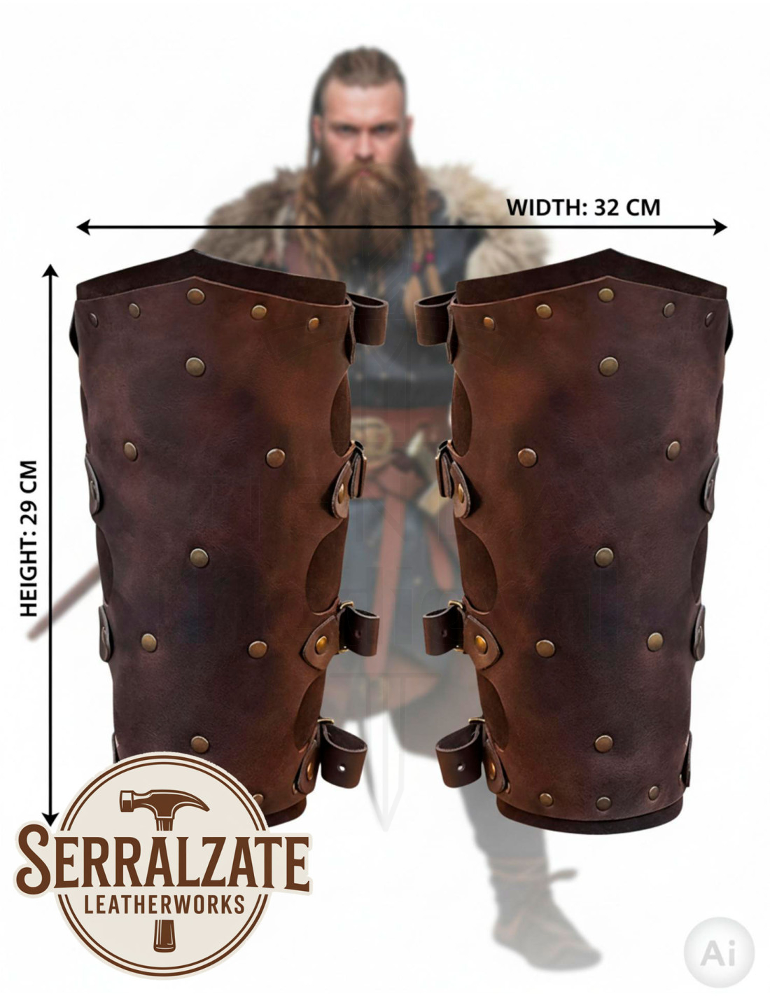 Il design in marrone scuro, rifinito con rivetti metallici e quattro cinturini regolabili con fibbie su ogni pezzo, garantisce una vestibilità sicura e personalizzabile, facilitando movimenti naturali e una vestizione rapida. Realizzate in Spagna, segno di tracciabilità e artigianato di qualità.