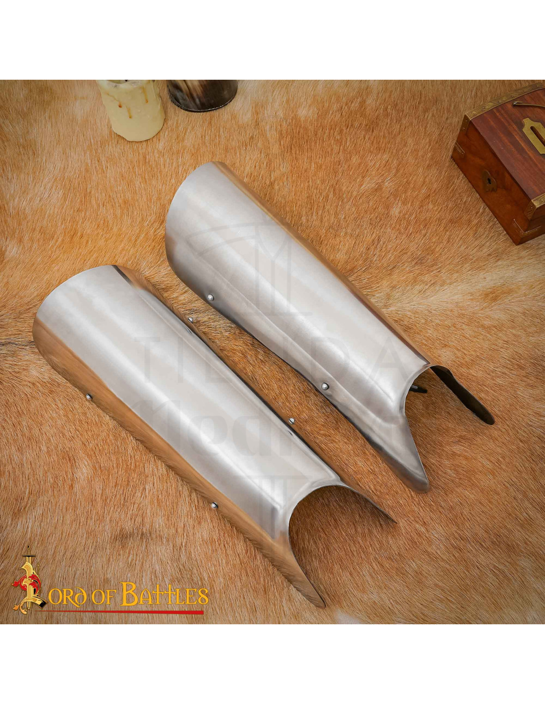 El diseño sobrio y el acabado metálico plateado aportan un aspecto genuino y versátil, ideal tanto para recreación seria como para exhibiciones o eventos temáticos. Al no llevar adornos innecesarios, se integran con distintos conjuntos de armadura y mantienen una línea funcional que realza la credibilidad de tu atuendo.