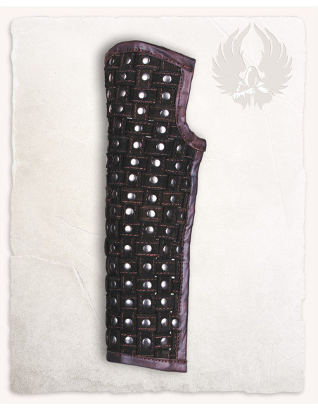 L'aspetto visivo ricorda i proteggibraccia ornamentali, simili a quelli mostrati nell'immagine, dove piccole pezzi quadrati intrecciati e ribattini circolari conferiscono un carattere resistente e una texture chiaramente artigianale. I bordi rinforzati con cuciture visibili non solo esaltano l'aspetto tradizionale, ma rinforzano anche le zone di maggiore attrito, prolungando la vita utile del prodotto.