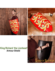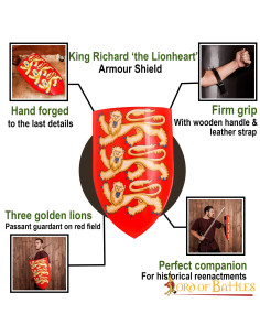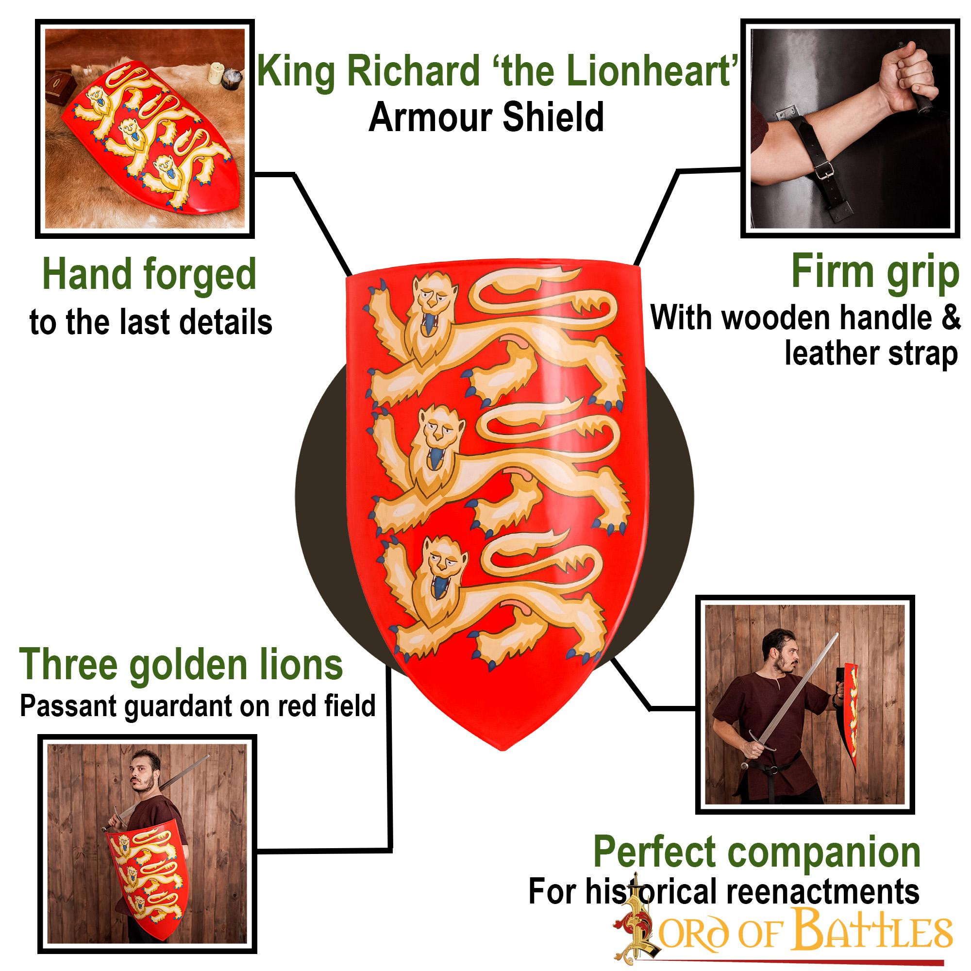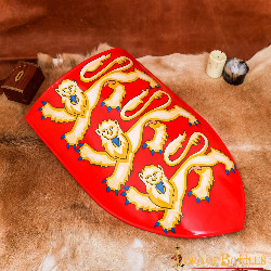 Non stiamo parlando di uno scudo qualsiasi qui, questo è lo scudo di re Riccardo Cuor di Leone. Fissato saldamente al muro, renderà la tua decorazione più elitaria che mai! I tre leoni d'oro che passano su un campo rosso (rosso) sono storicamente ispirati per i dettagli intricati.