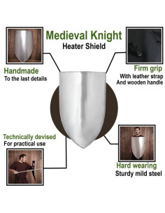 Lo scudo medievale da personalizzare con misure di 70 x 50 cm è il complemento perfetto per le tue ricreazioni storiche o decorazioni tematiche. Meticolosamente realizzato a mano in acciaio resistente, questo scudo misura 28 pollici di lunghezza e 20 pollici di larghezza, fornendo una dimensione ideale sia per un uso pratico che decorativo.