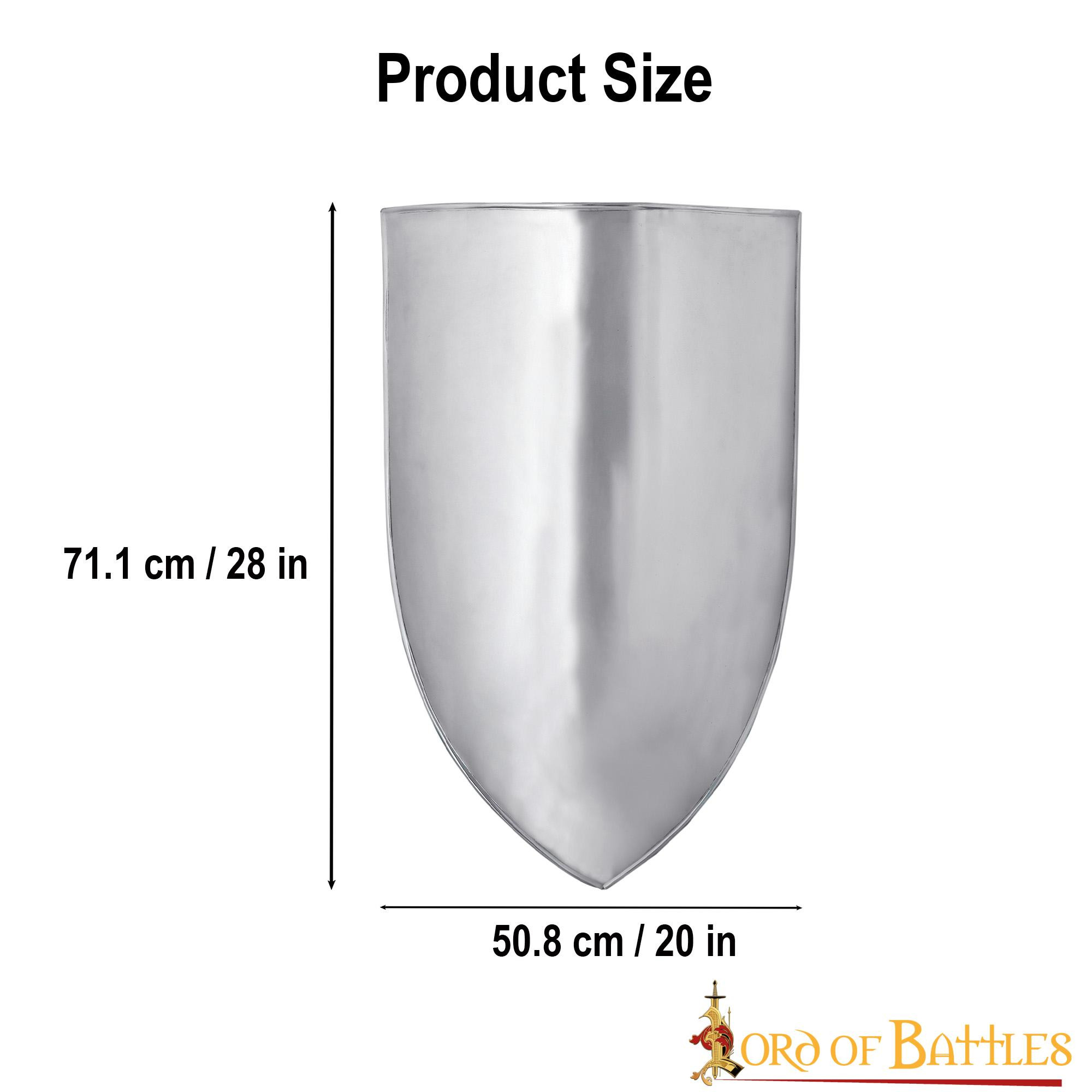 Prodotto dal rinomato marchio Lord of Battles, questo scudo garantisce una qualità superiore e duratura. Il suo materiale principale è l'acciaio, che lo rende un pezzo resistente e autentico. Con un'altezza di 28 pollici, questo scudo offre una presenza imponente e realistica che impressionerà allo stesso modo gli appassionati di storia e gli amanti dell'arredamento a tema.
