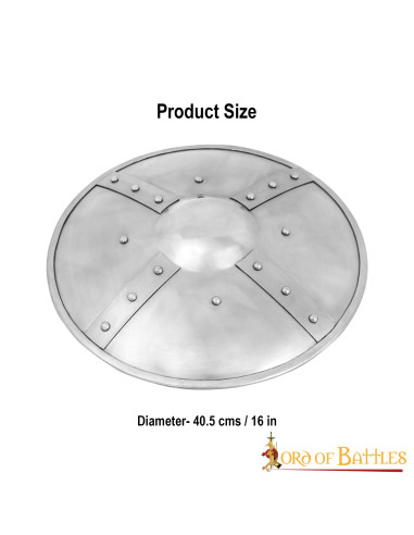 La versione lucidata viene consegnata con uno strato di olio protettivo contro la corrosione, facilmente pulibile. Quindi, che tu stia aggiornando la tua collezione di scudi, aggiungendo un tocco medievale all'ambiente circostante o liberando la tua creatività artistica, questo scudo in acciaio lucido è la scelta perfetta. Non aspettare oltre per rendere tua questa tela di storia e immaginazione!
