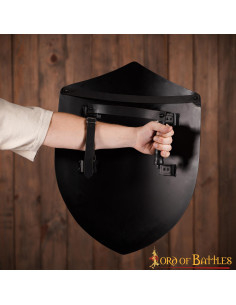- Forgiato a mano con dettagli autentici: questo scudo è stato forgiato a mano con attenzione ai dettagli autentici di epoca medievale. Dalla sua forma al suo colore nero, riflette la vera essenza dell'epoca.
